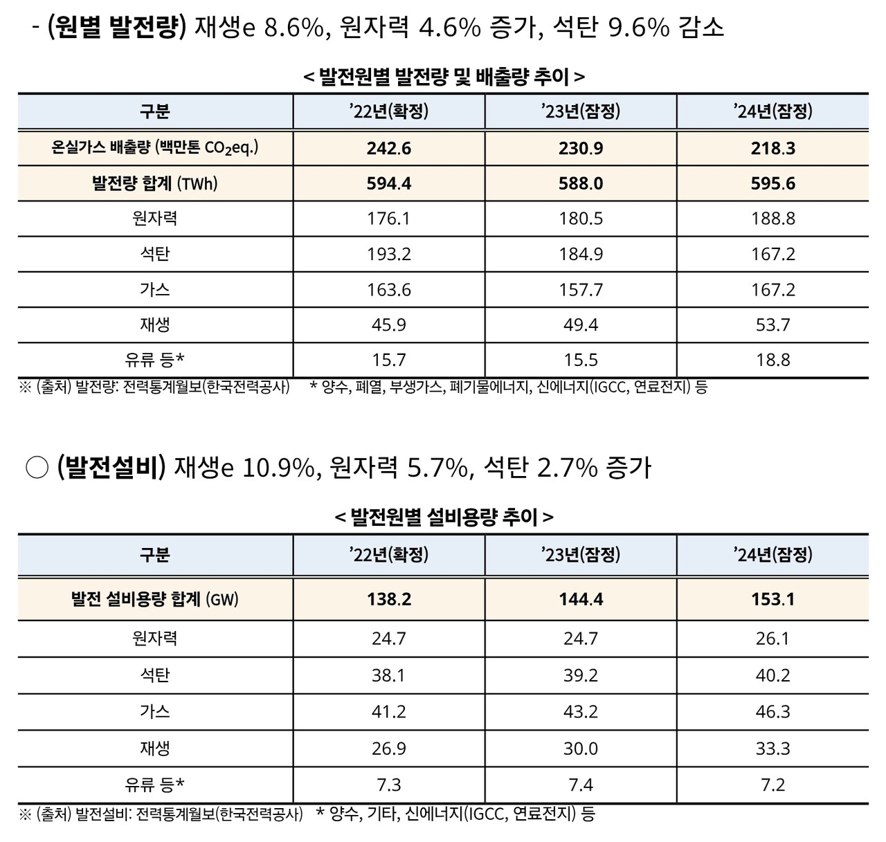 ▶ 발전 부문 배출 감소…석탄 줄고 재생에너지 확대 전환(발전) 부문은 2억 1,834만톤으로 전년 대비 5.4% 감소했습니다. 이는 석탄 발전량이 9.6% 줄고, 재생에너지와 원전 발전량이 각각 8.6%, 4.6% 증가한 데 기인한 것으로 분석됩니다. 전기 총사용량은 588.0TWh에서 595.6TWh로 1.3% 증가했지만, 저탄소 전원 비중 확대로 배출량은 오히려 줄었습니다. 이는 전환 부문에서의 재생에너지 확대가 실제 배출 감축으로 이어지고 있음을 보여주는 사례입니다.
