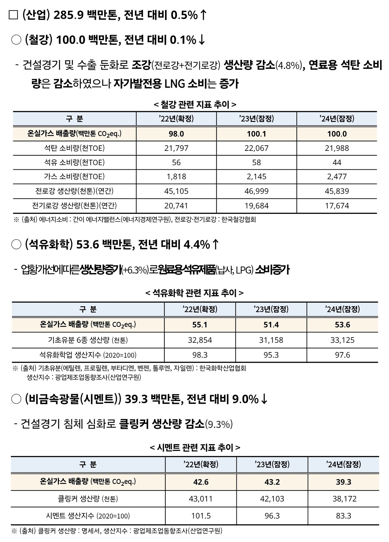 반면, 철강과 시멘트는 생산 감소로 인해 배출량도 줄었습니다. |