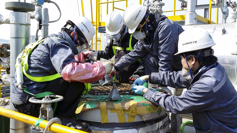한국화학연구원 직원들이 메탄과 스팀, CO₂를 활용한 합성가스 생산용 촉매를 충진하고 있다. 이 기술은 가스엔텍에 이전됐다.(사진=가스엔텍)